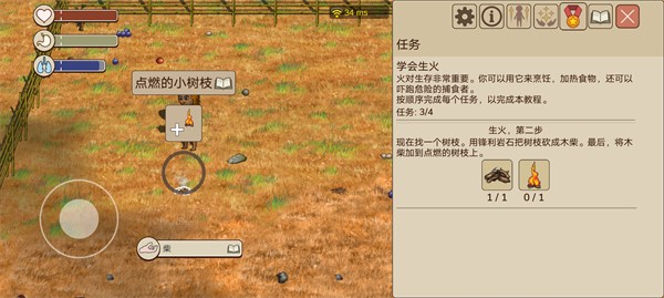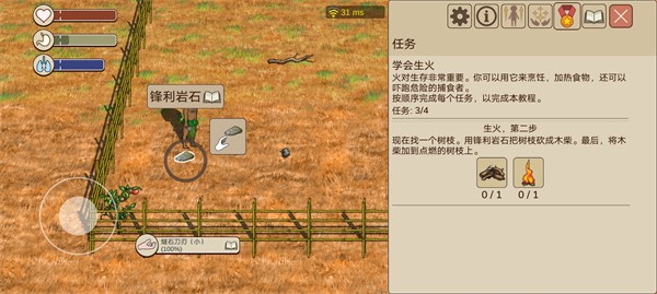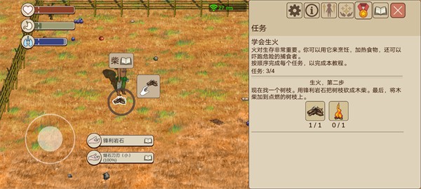 2、如图一找到枯枝不用管,然后如图二再去找锋利岩石对枯枝进行加工变成柴,再用柴对生火的树枝进行加工让它烧的更旺。