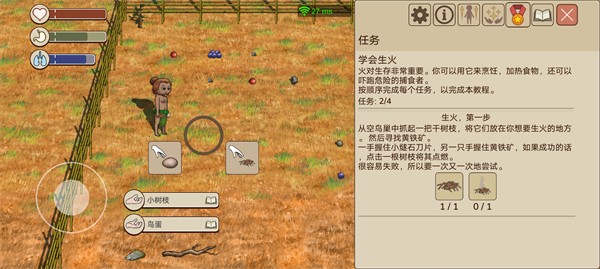 1、点击空巢拾取干树枝,点击地面放下干树枝后,拾取黄铁矿,一手燧石刀刃,一手黄铁矿,就可以对干树枝进行生火操作。
