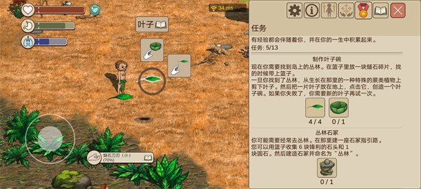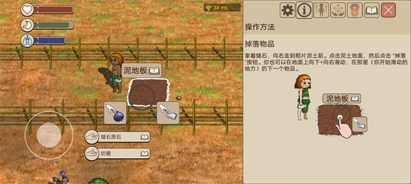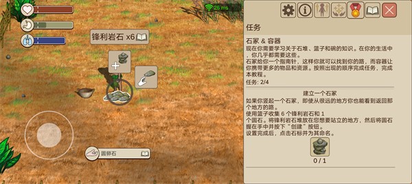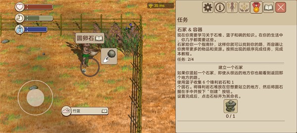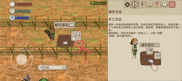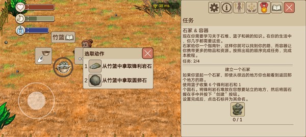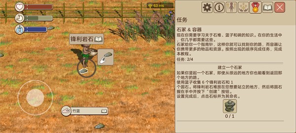 1、用篮子收集六个锋利岩石和一个圆卵石后,将六个锋利岩石放在地上,手朝下是放,手朝上是捡。