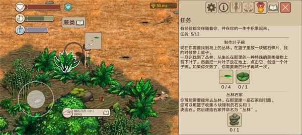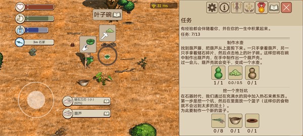 1、拿着燧石碎片去找葫芦藤蔓割葫芦,然后把葫芦肉放到叶子碗里。