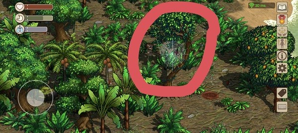 1、拿之前逮到的蟋蟀跑到一个类似雨林的地方,去找那种有蜘蛛趴在网上的树,如下图红圈内所示。
