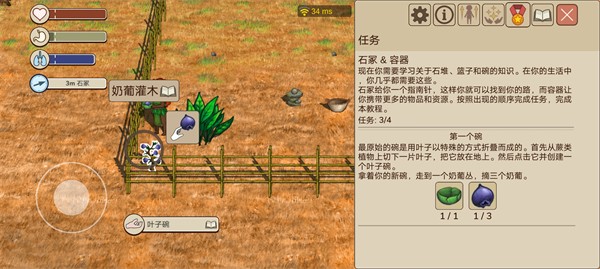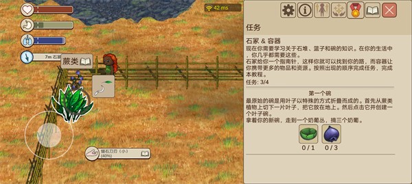 2、然后把割下来的草放到地上制作叶子碗,最后拿着碗去左下采摘三个奶葡即可。