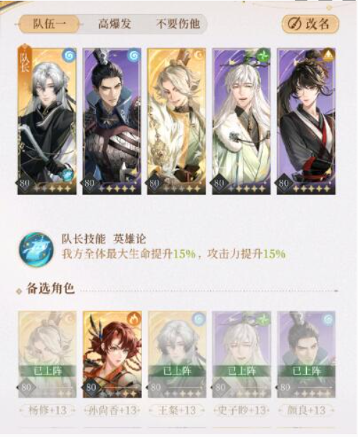 王粲80+13(cd-1),颜良80+13,狮子喵80+13(技能减伤),杨修80+13,阿蝉80+13。