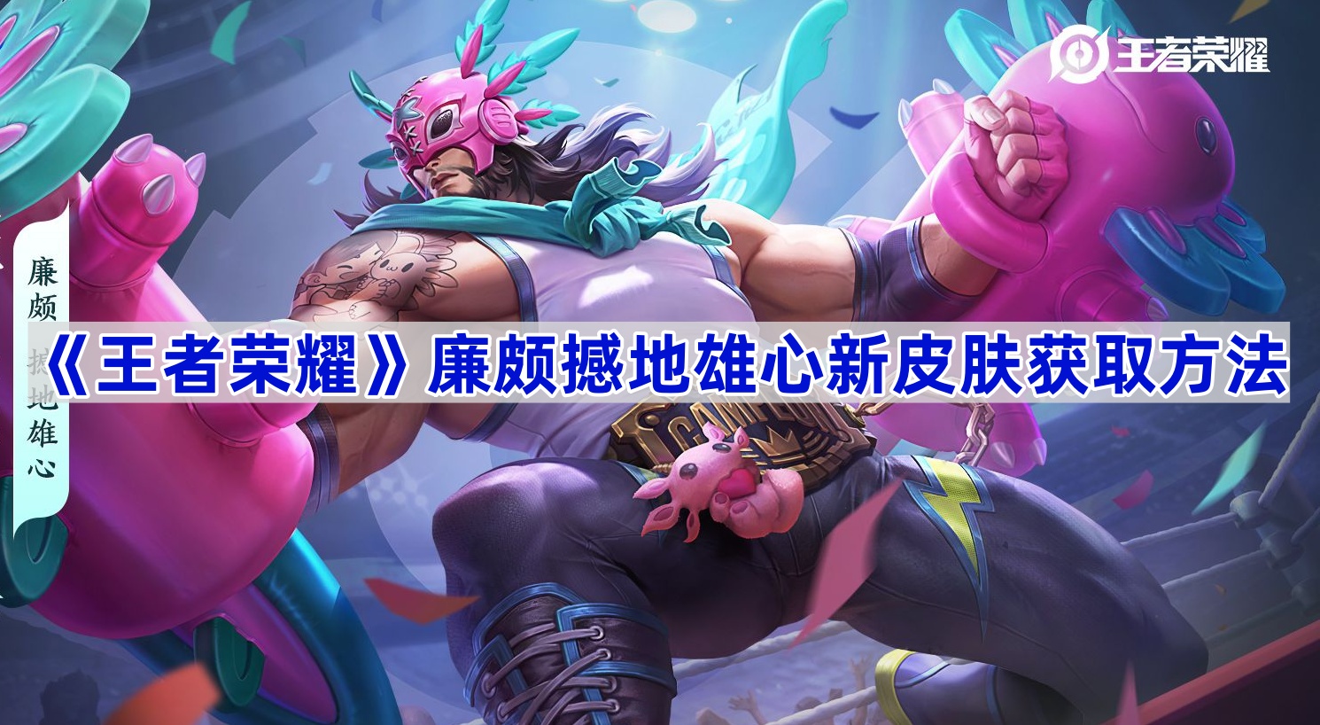 1、【廉颇撼地雄心】为一款史诗品级皮肤,以摔角手为主题,整体以粉色为主,为廉颇设计了全新的形象。