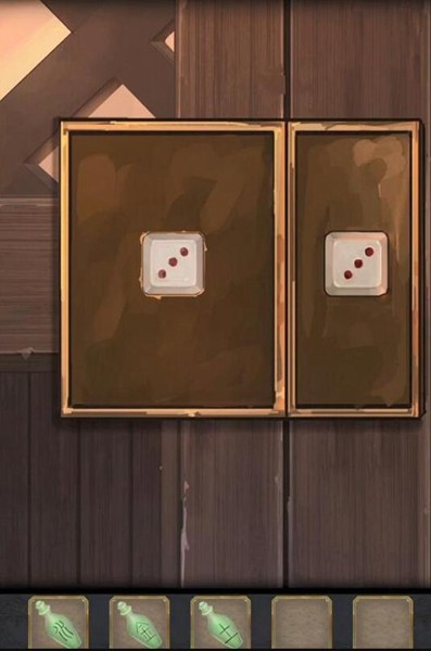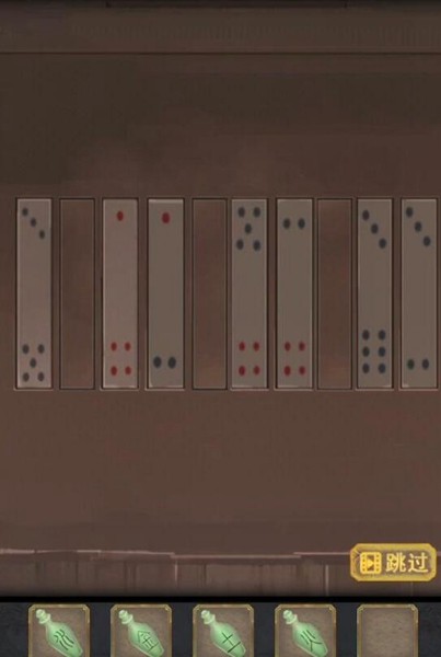 14、在桌上完成猜牌游戏得到【瓷瓶-火】【九点骨牌】,鞋子里找到【三点骨牌】,抽屉里【五点骨牌】。根据窗帘的提示在下方放上骨牌调整到下图的样子,获得【圆形木板】。