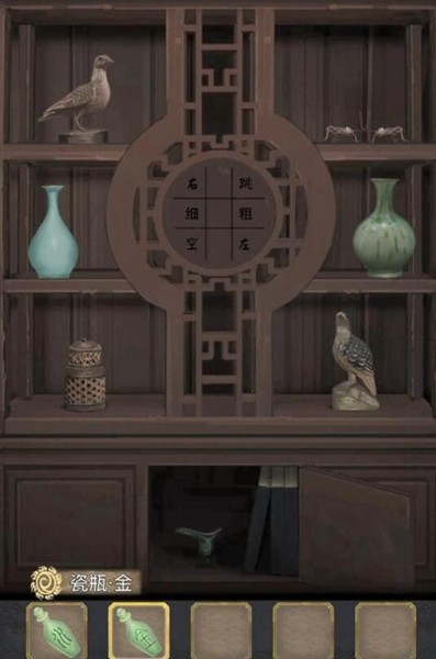 8、装到算盘上获得【铜钱】,放入铜钱开始猜正反,猜对了得到【瓷瓶-金】和【鸟型钥匙】。