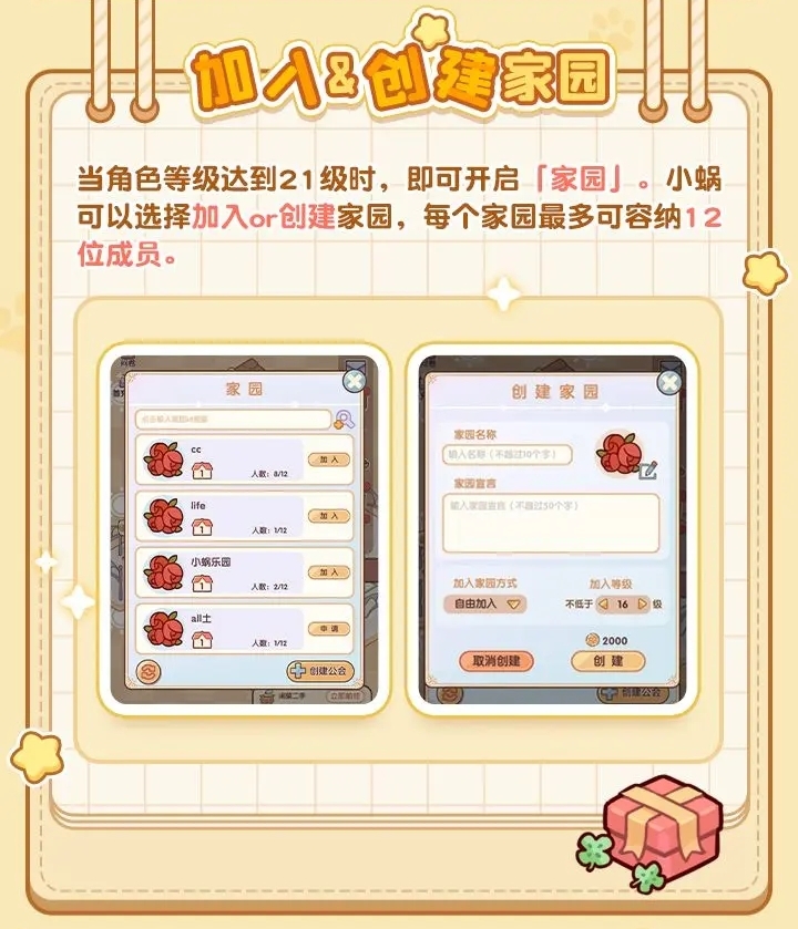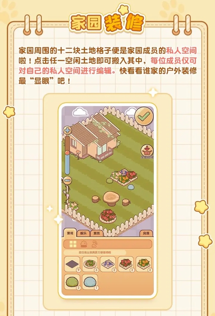 1、家园最多12人,每人都可以选择一块空闲土地搬入并编辑。
