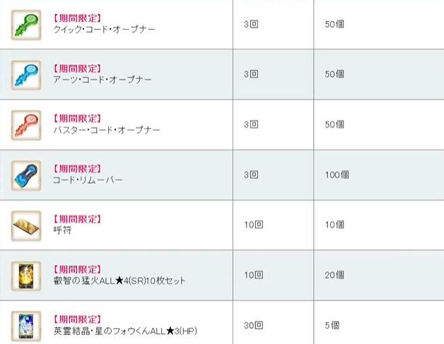 2100万QP、五星全职阶种火10枚、10万友情点、10个茶壶、100个绿方块、3星HP芙芙10枚、3星ATK芙芙10枚、呼符10枚
