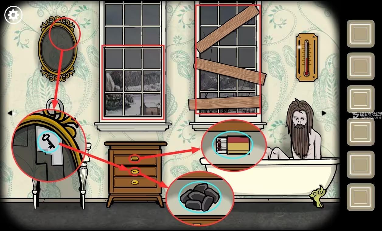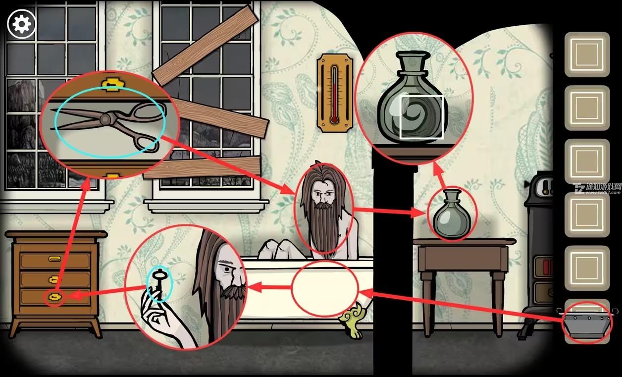 6、把热水倒到浴缸里,此时房间里的温度达到了最高,感到温暖的弗兰克交给我们一把(钥匙)。