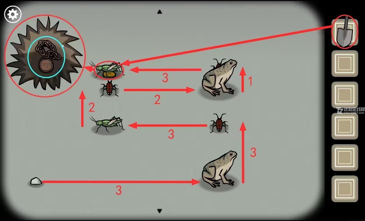 6、点击地上的蛤蟆,把(虫子)和(草蜢)一起放到地上。