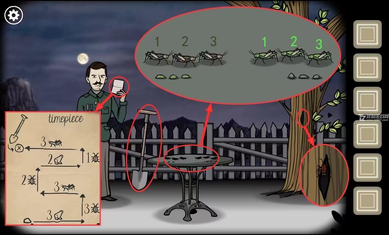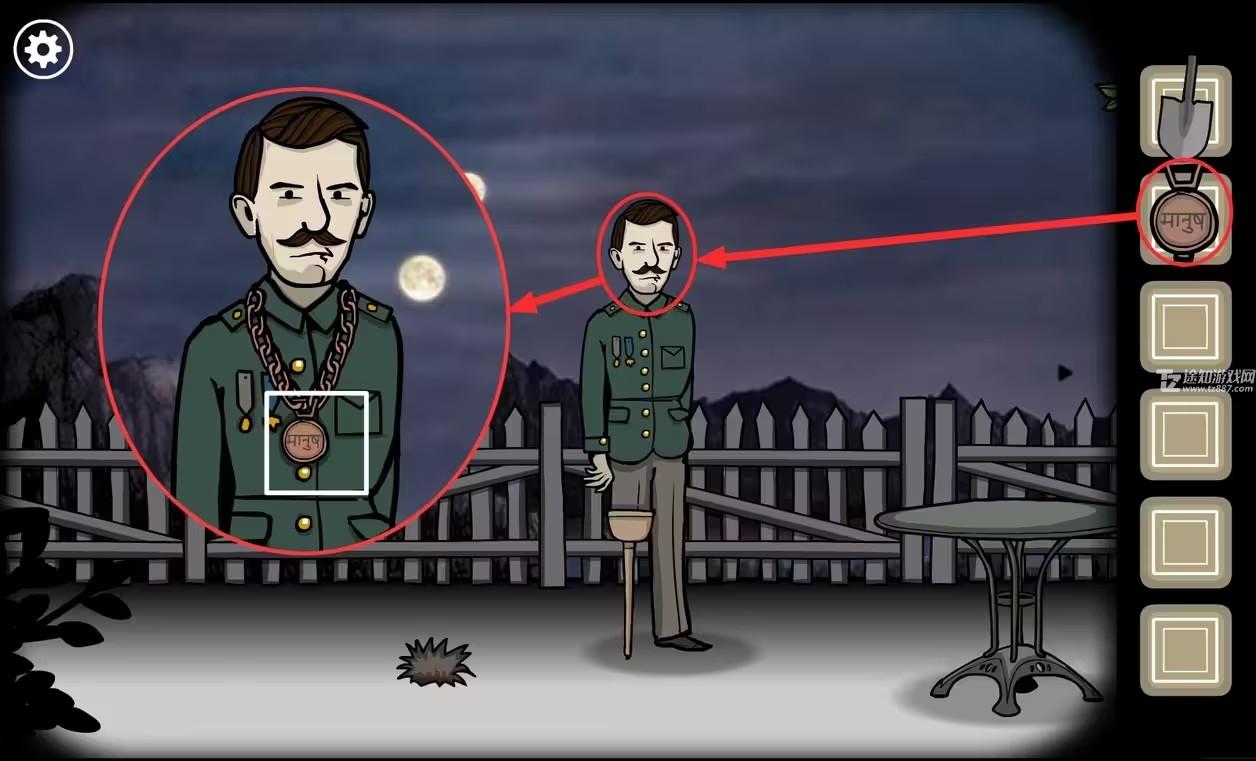 7、根据藏宝图的指示,在最后的点上放上带有X的硬币,用(铲子)挖出地下带有人间道的(怀表)。