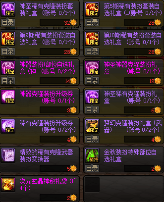 金秋礼包花篮不仅有稀有克隆装扮套装和神器装扮,还可以追忆之前不同期数的稀有装扮。