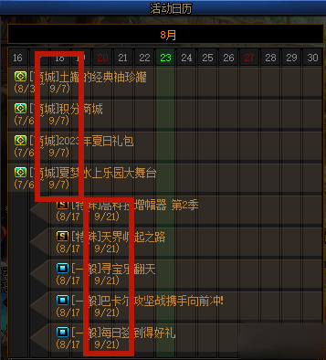 先来看看现存的活动日历,一共有两个活动结束时间节点,一个是9月7日,一个是9月21日,这两个就是下一次新礼包的上线时间了。