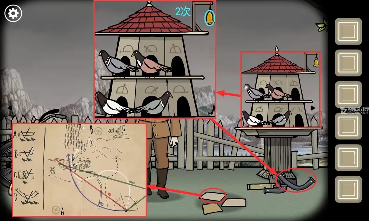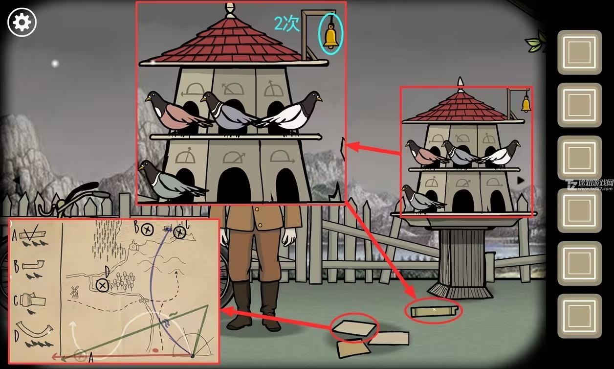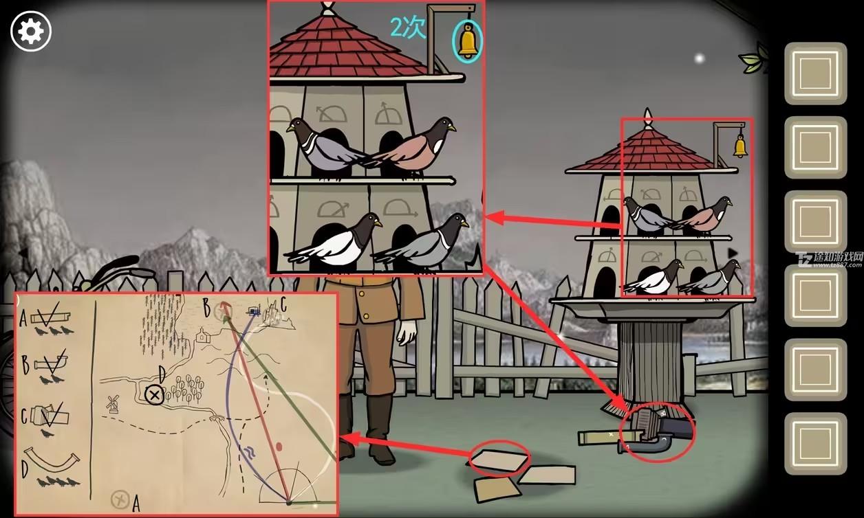 4、点击鸽子屋,将鸽子按图摆放;点击两次铃铛,鸽子飞出去带回了A点的零件。
