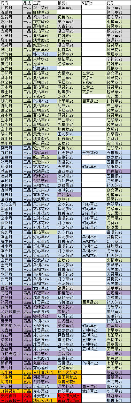 天元神丹:补天芝*9+地心淬灵乳*2+鸡冠草*1(三叶青芝*1+地火心芝*12+阴凝草*1)