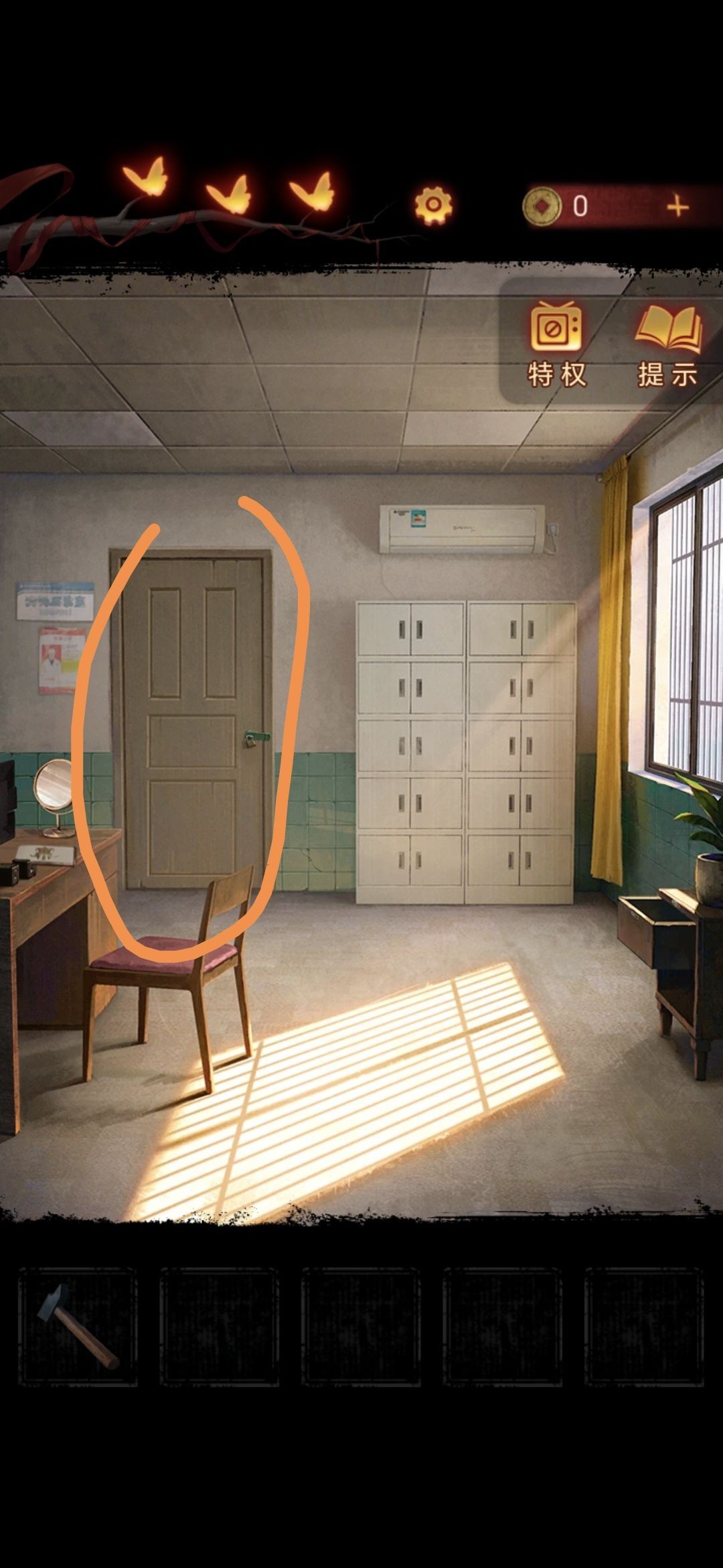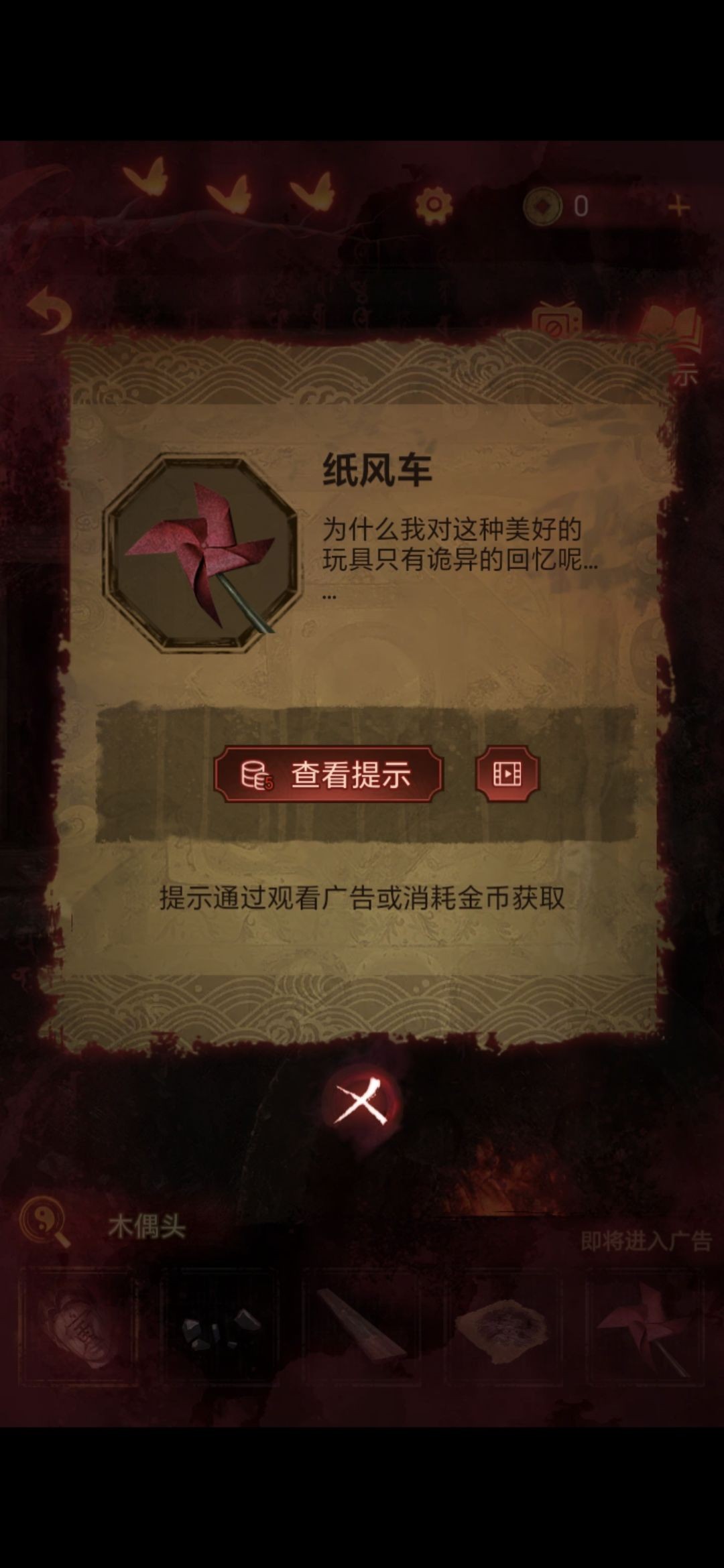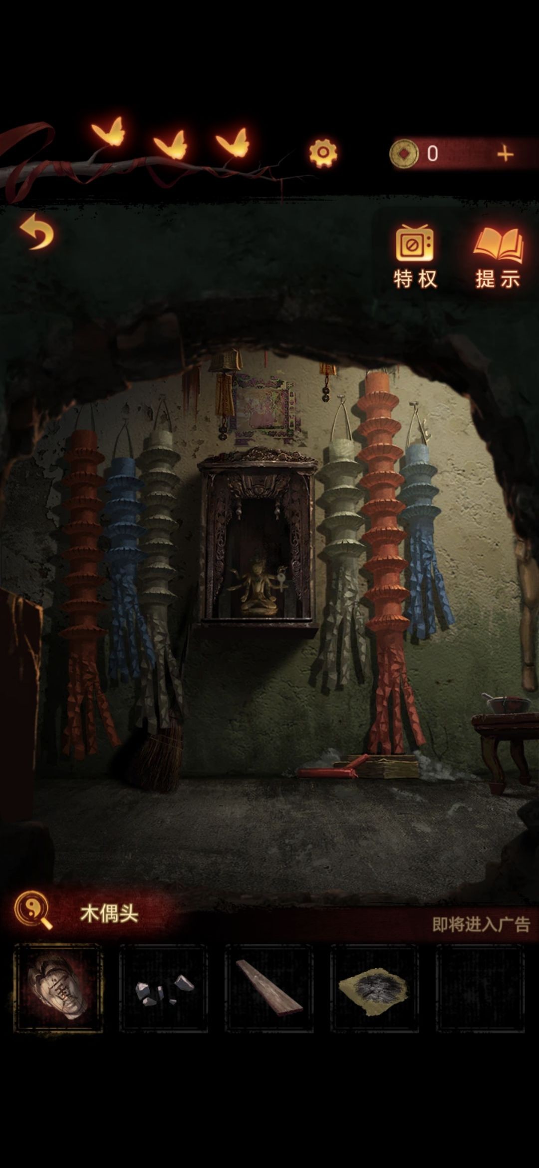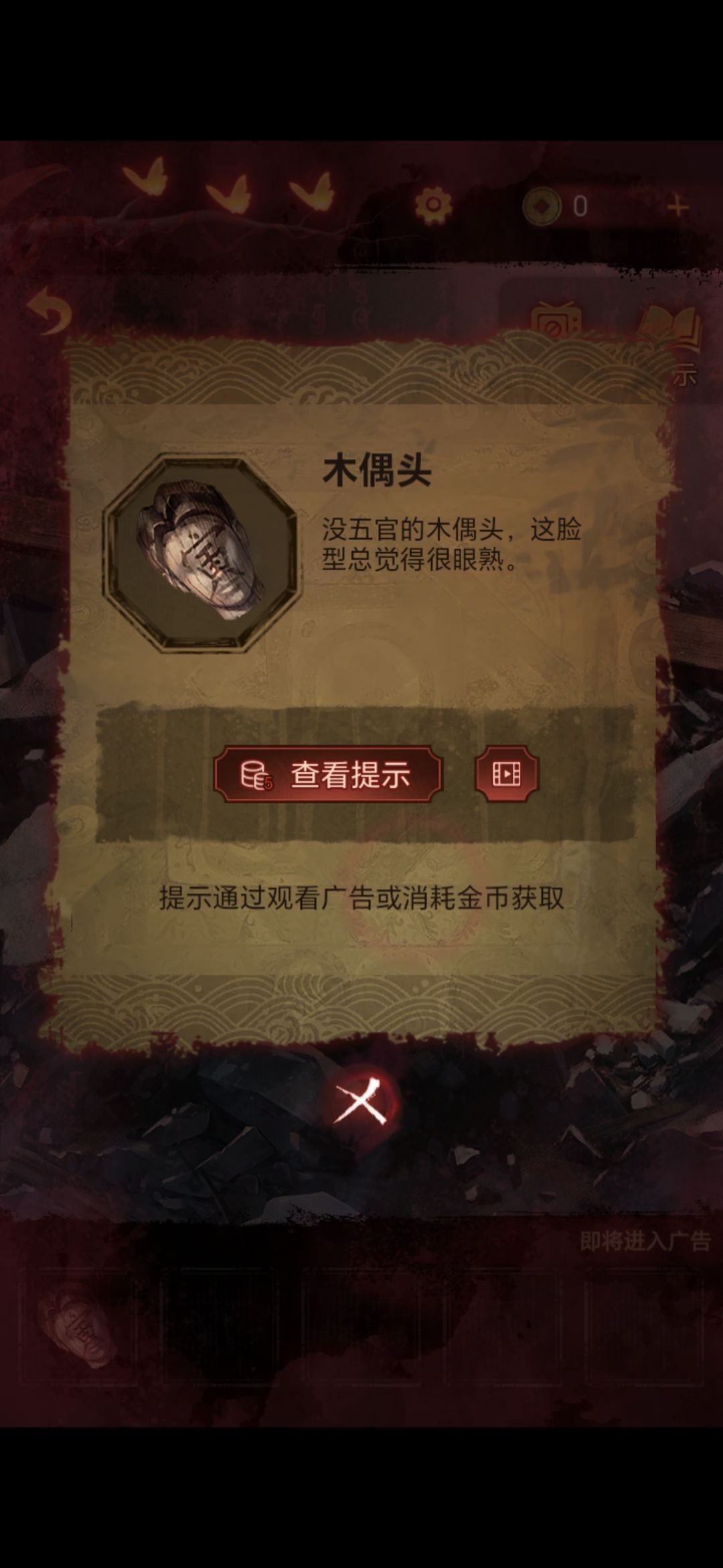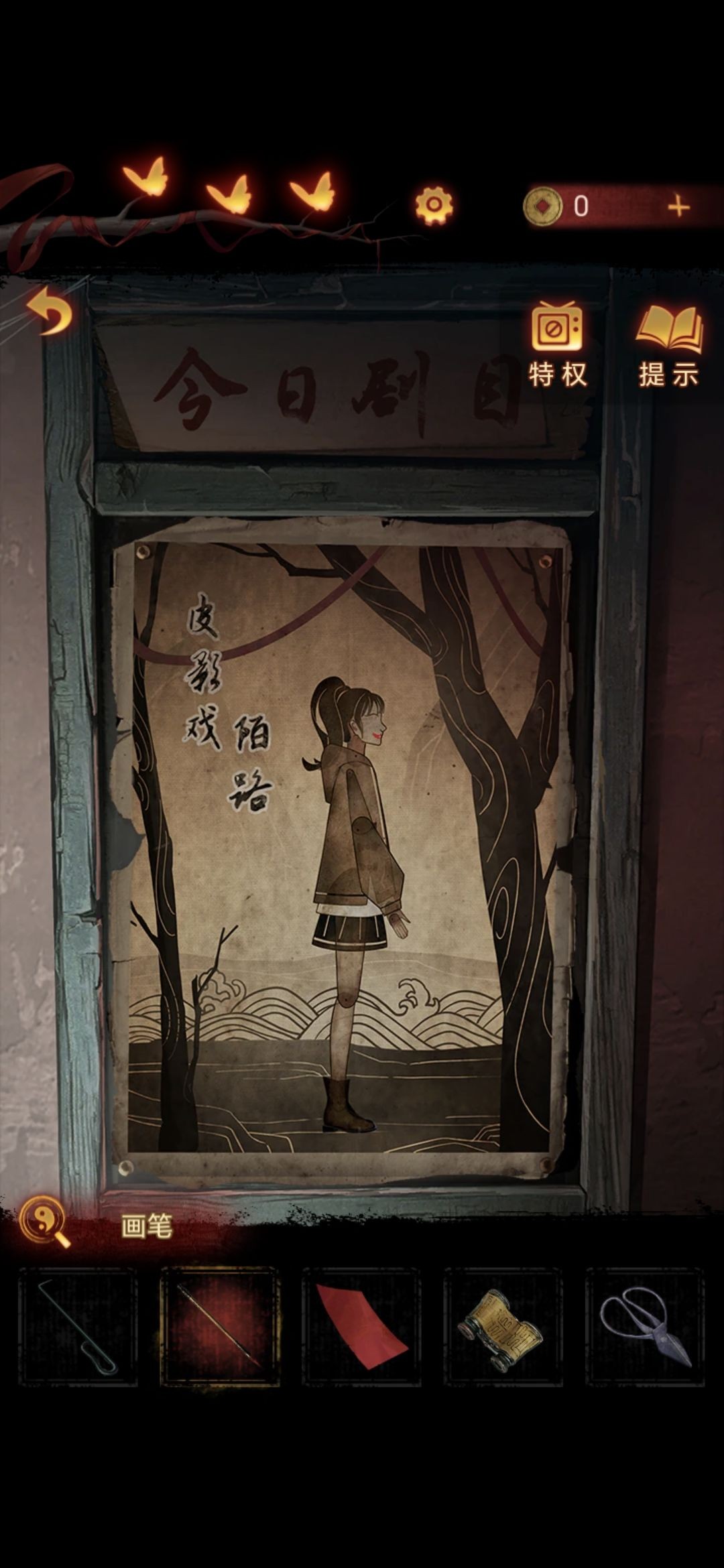 第二天,点击窗户,用望远镜看窗户,点击钟某测试,得知1皮影树木,2木偶,3两个木偶,4木偶,5脸谱,6神龛,7剪纸,8石人,9蝴蝶,10布偶,之后获得锤子