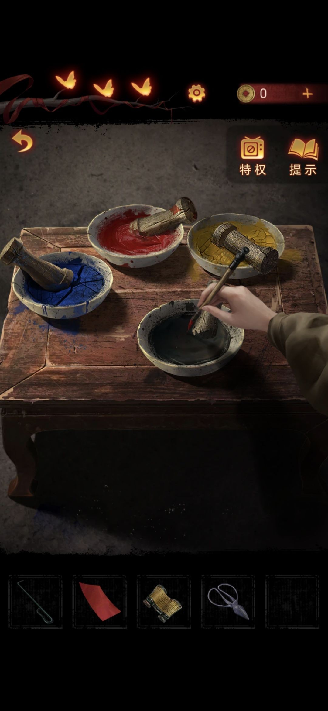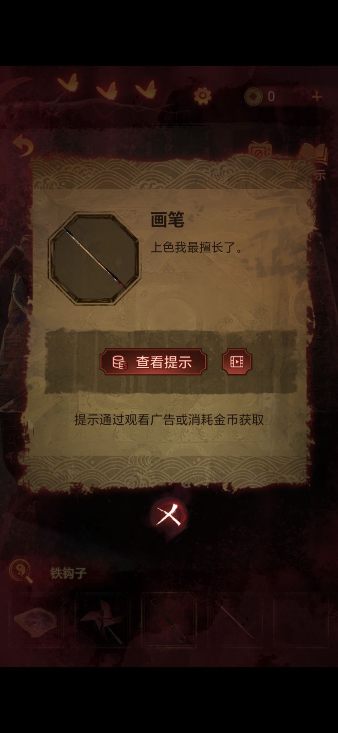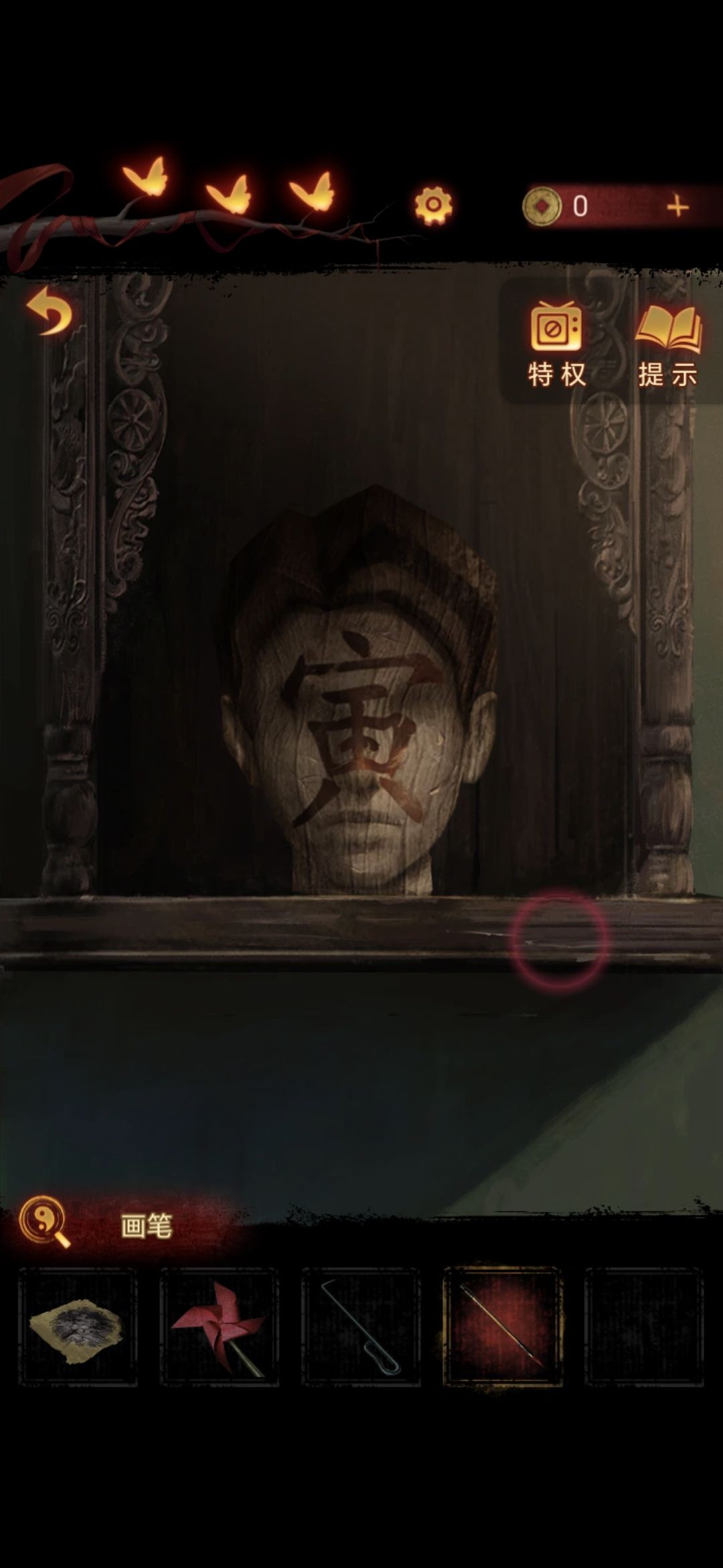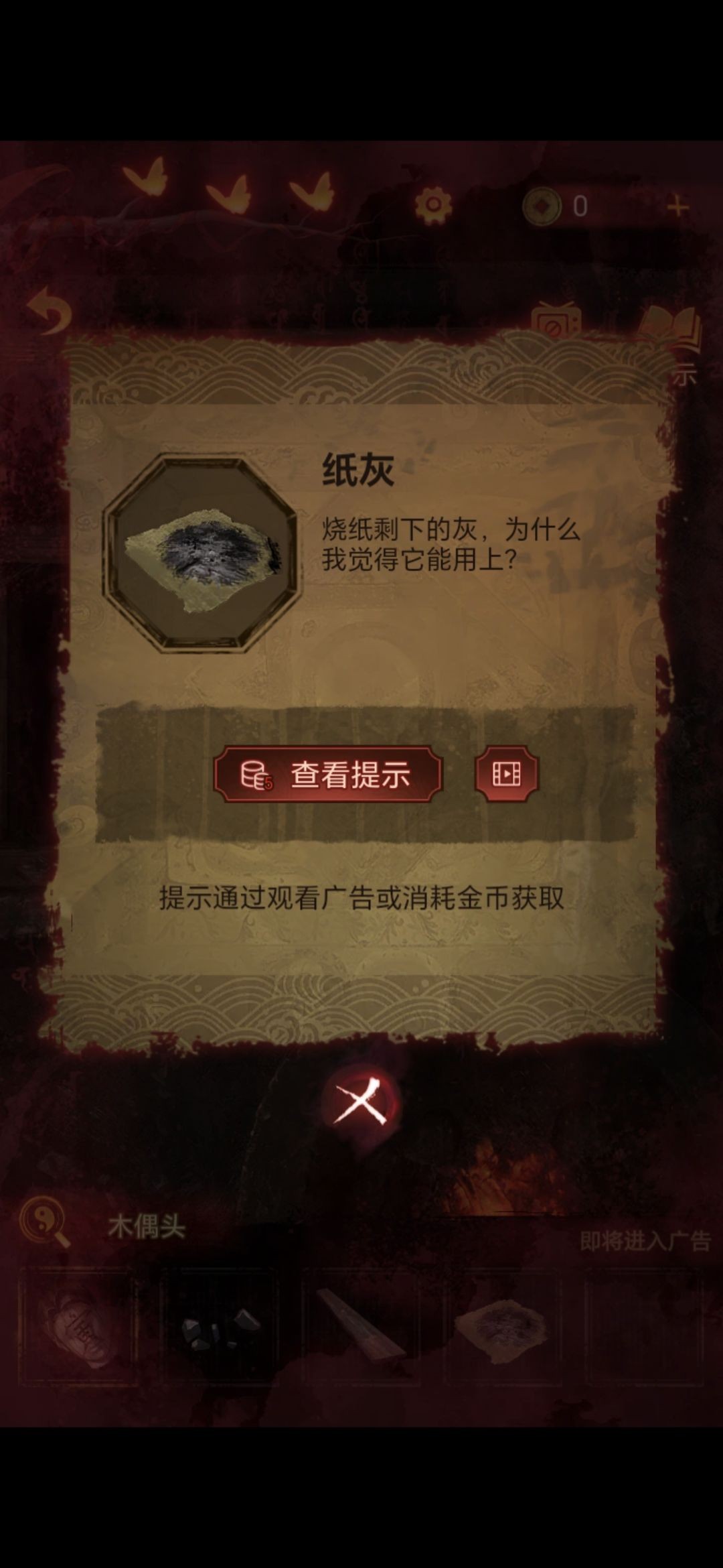第二天,点击窗户,用望远镜看窗户,点击钟某测试,得知1皮影树木,2木偶,3两个木偶,4木偶,5脸谱,6神龛,7剪纸,8石人,9蝴蝶,10布偶,之后获得锤子