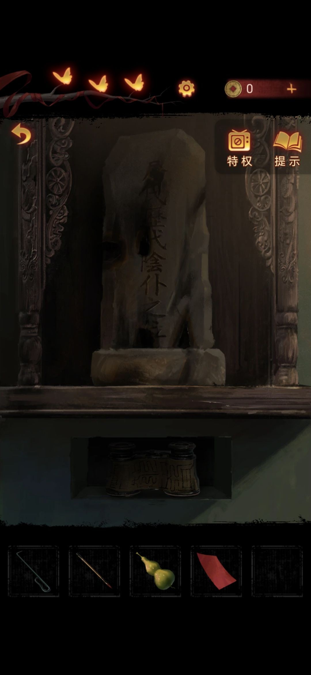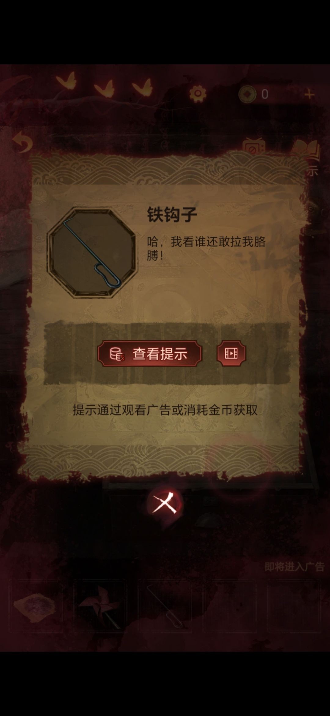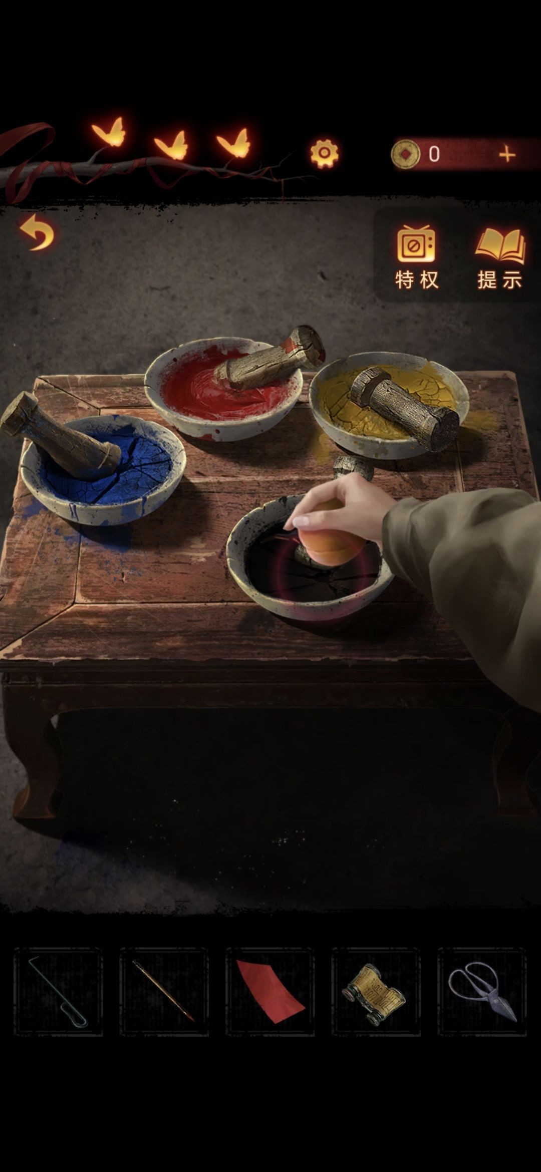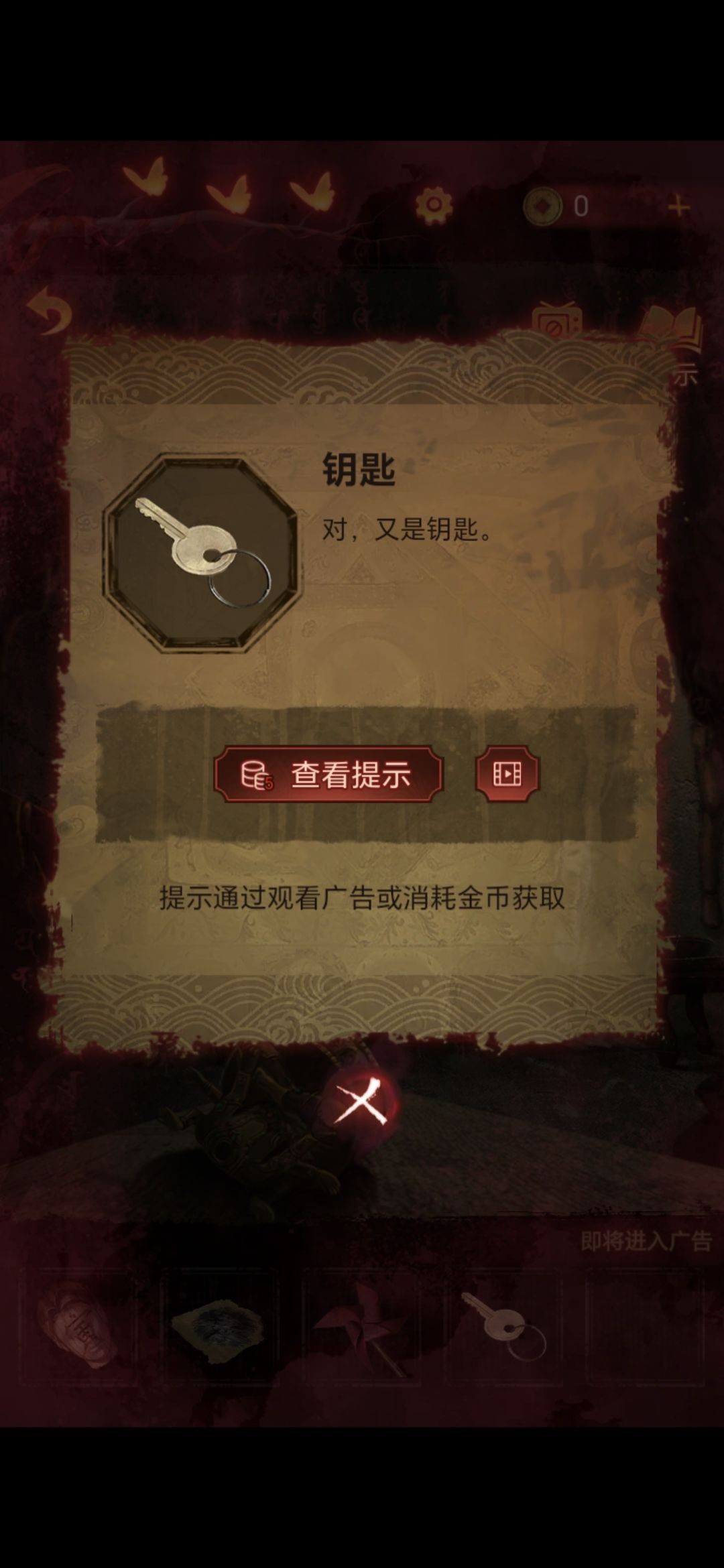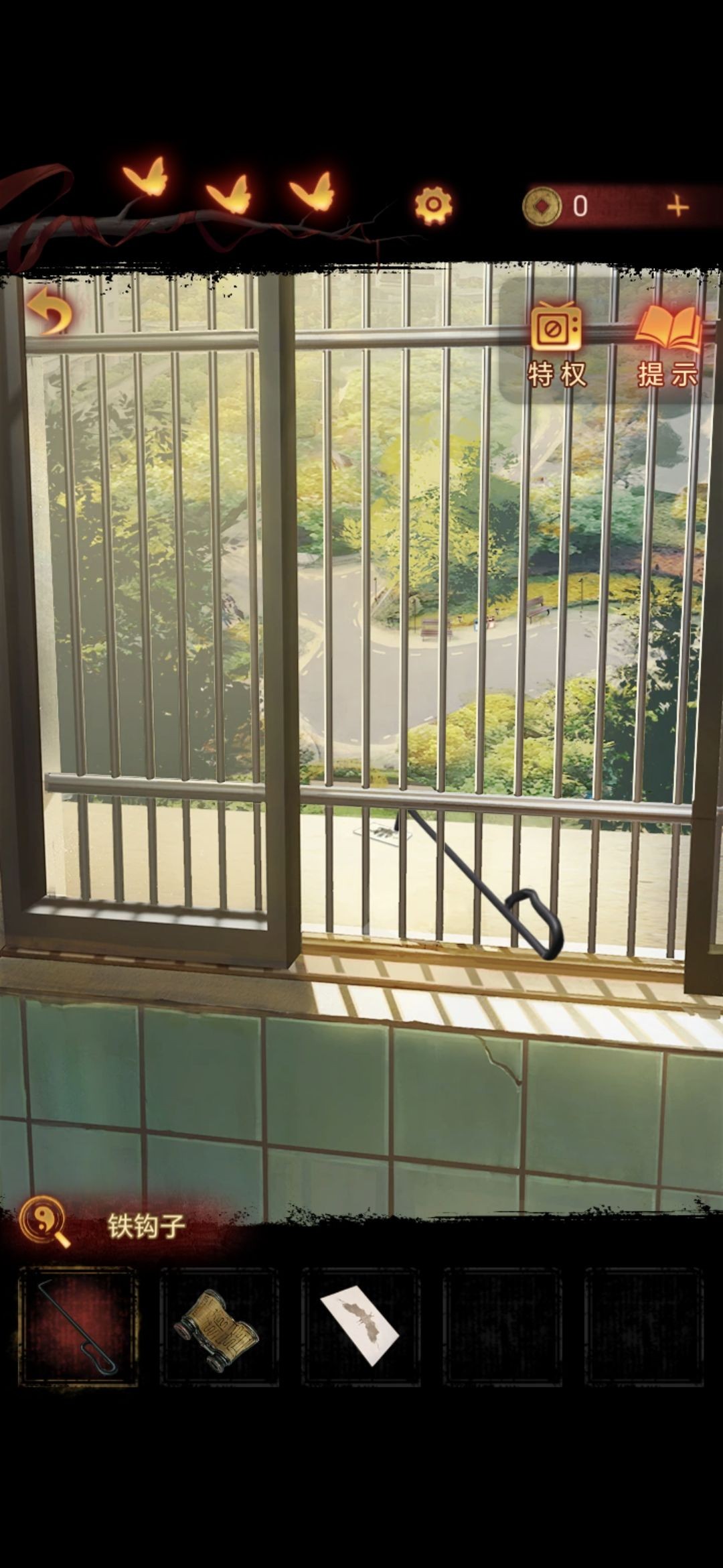 第二天,点击窗户,用望远镜看窗户,点击钟某测试,得知1皮影树木,2木偶,3两个木偶,4木偶,5脸谱,6神龛,7剪纸,8石人,9蝴蝶,10布偶,之后获得锤子
