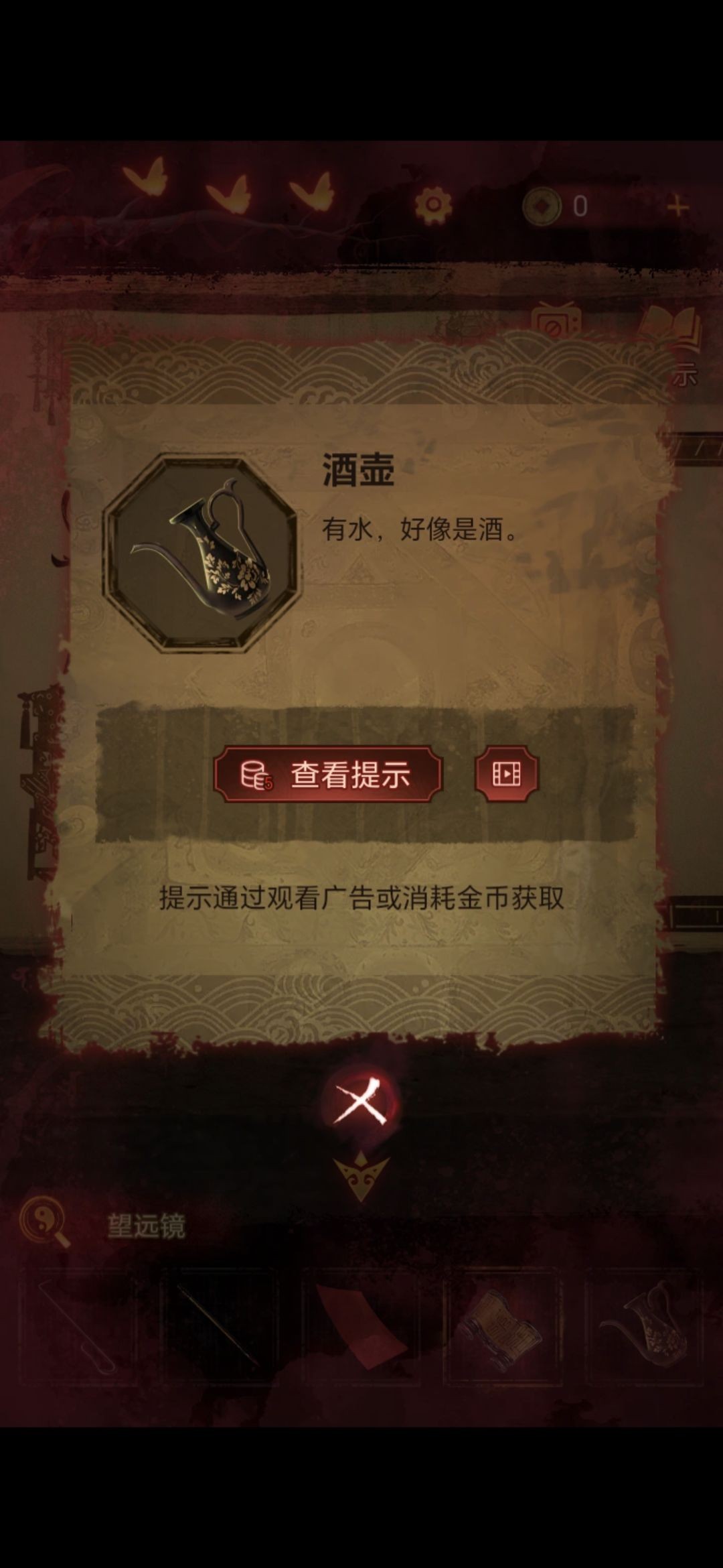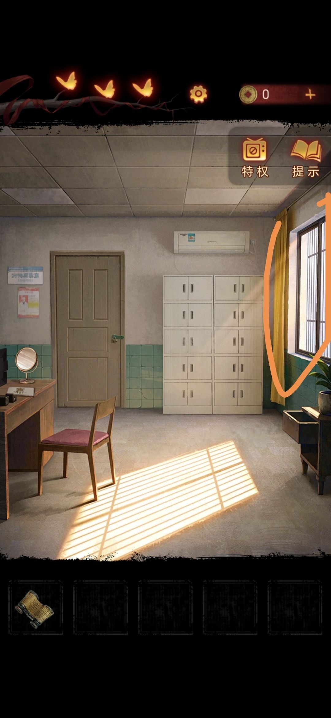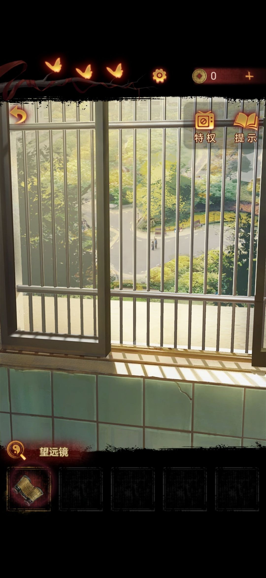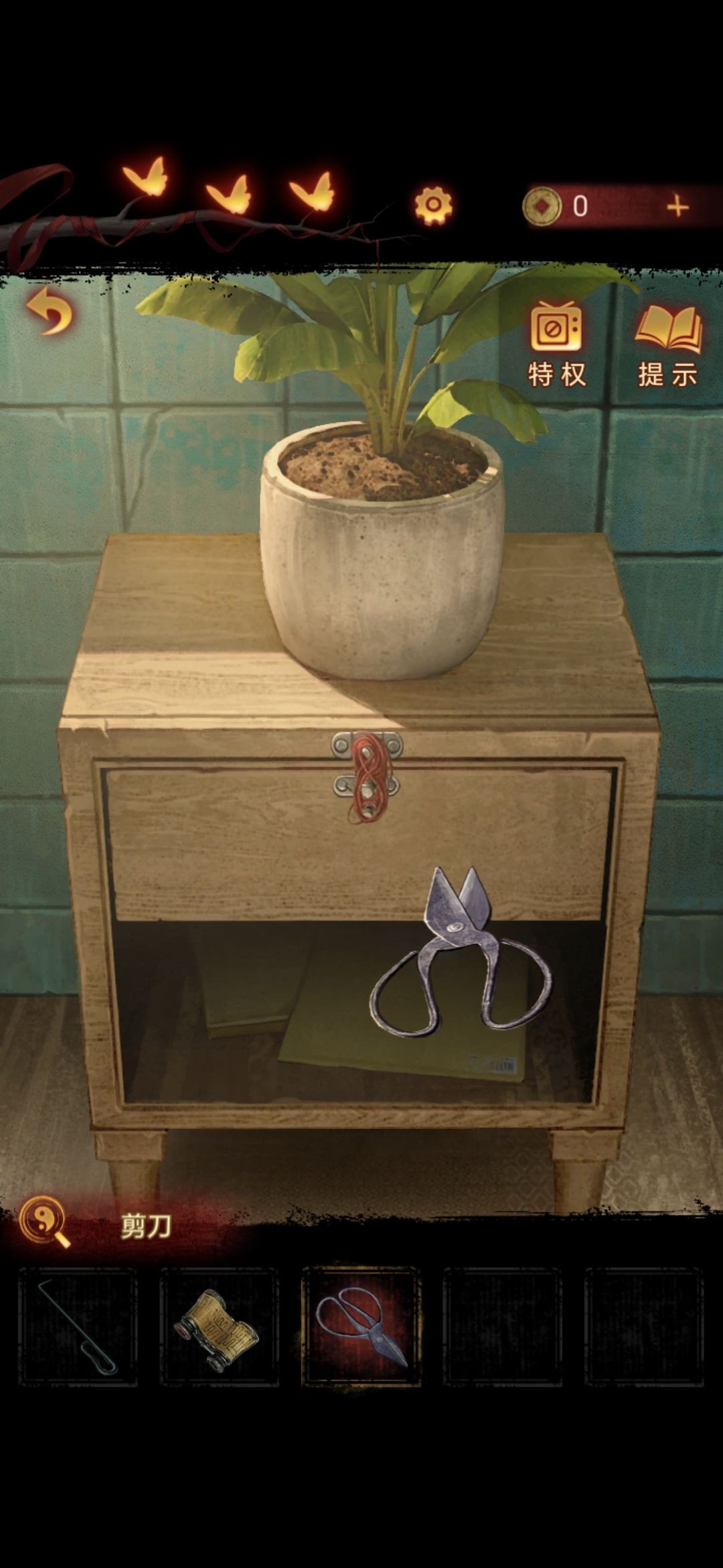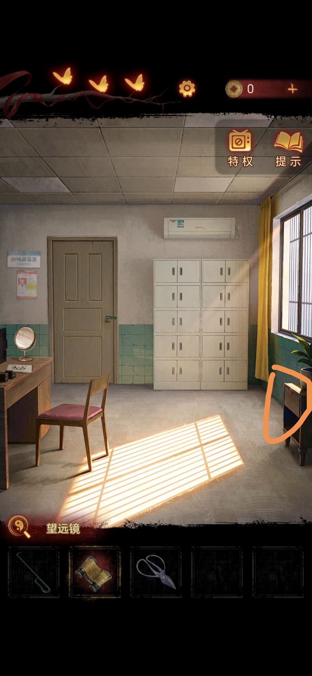 用望远镜看镜子,进入幻觉,用剪刀剪开柜子上面缠的线,获得卡片