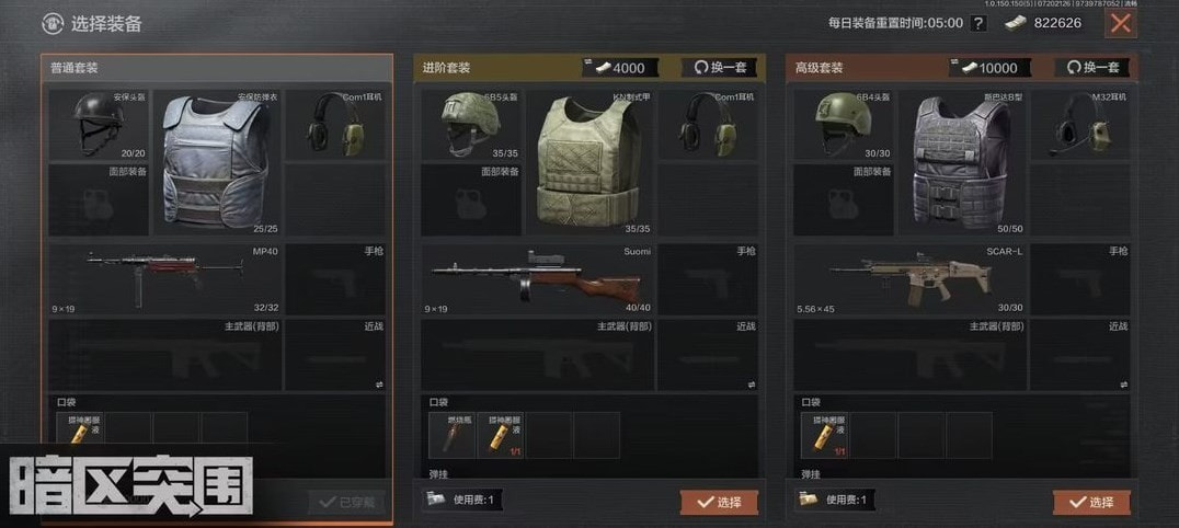 以上套装都可以选因为我们完全不打架武器就不重要,优先选择弹挂12格、8格和背包8格、9格大一点的,口袋有额外送燃烧瓶或背包额外送消炎止痛片的。