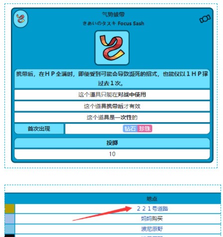 2、携带该道具的宝可梦在满Hp时若被一击导致HP归零,则会保留1点HP而不进入濒死状态。