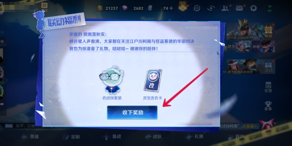 王者荣耀联动名侦探柯南活动已经上线,除了上线联动皮肤外,玩家登录还可以免费领取一款限定灵宝装扮,很多人不知道这么领取,小编下面就为大家带来详细的领取教程,还不知道的小伙伴可以来看一看。