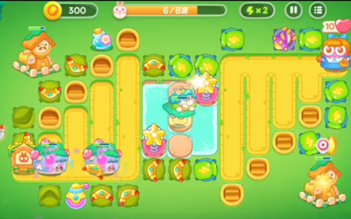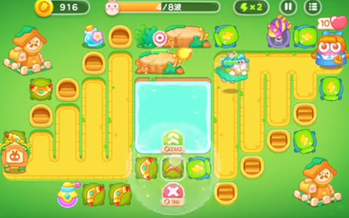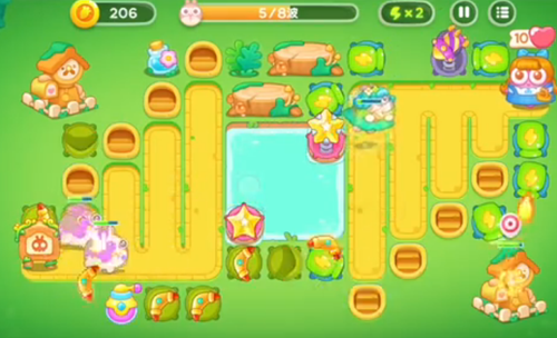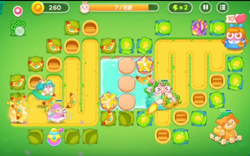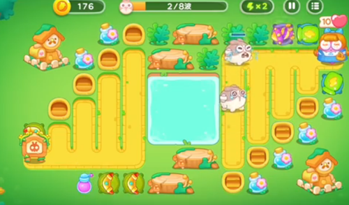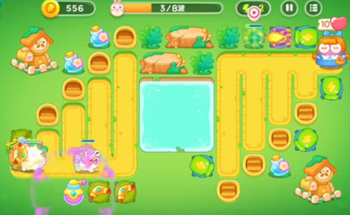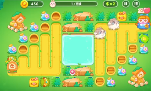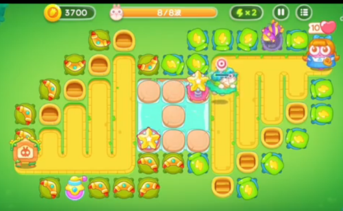 1、右上角是一个瓶子炮左下角就是一个新塔炮,瓶子炮攻击兔子,下面的攻击木桩。