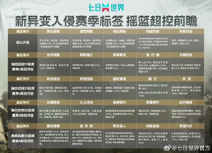 七日世界新异变入侵赛季摇篮超控效果改了什么?随着游戏《七日世界》1.3版本更新,官方也宣布将进行赛季标签的更新并公布了摇篮超控前瞻。不过过一段时间后官方宣布将修改一些摇篮超控的效果,那么下来就和小编一起看看《七日世界》新异变入侵赛季摇篮超控效果改动介绍吧。