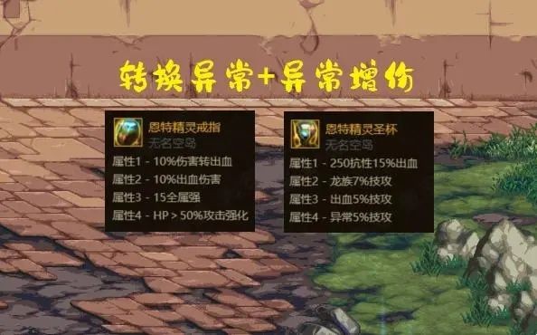 恩特戒指最大的特色在于,可以转换4种异常伤害,这个词条搭配特殊3件套效果非常好,比如戒指附加“转换10%出血伤害”“转换10%中毒伤害”,特殊3件套就可以触发2个5%技攻,变相提高了整体伤害。