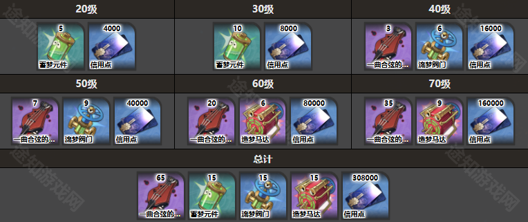 61-70级:信用点*160000、造梦马达*9、一曲合弦的幻景*35