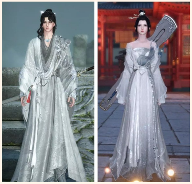 女角色纯色的发簪和男角色微卷的长发显得总体非常温柔,师门寓意也挺好,很适合作为情侣装。