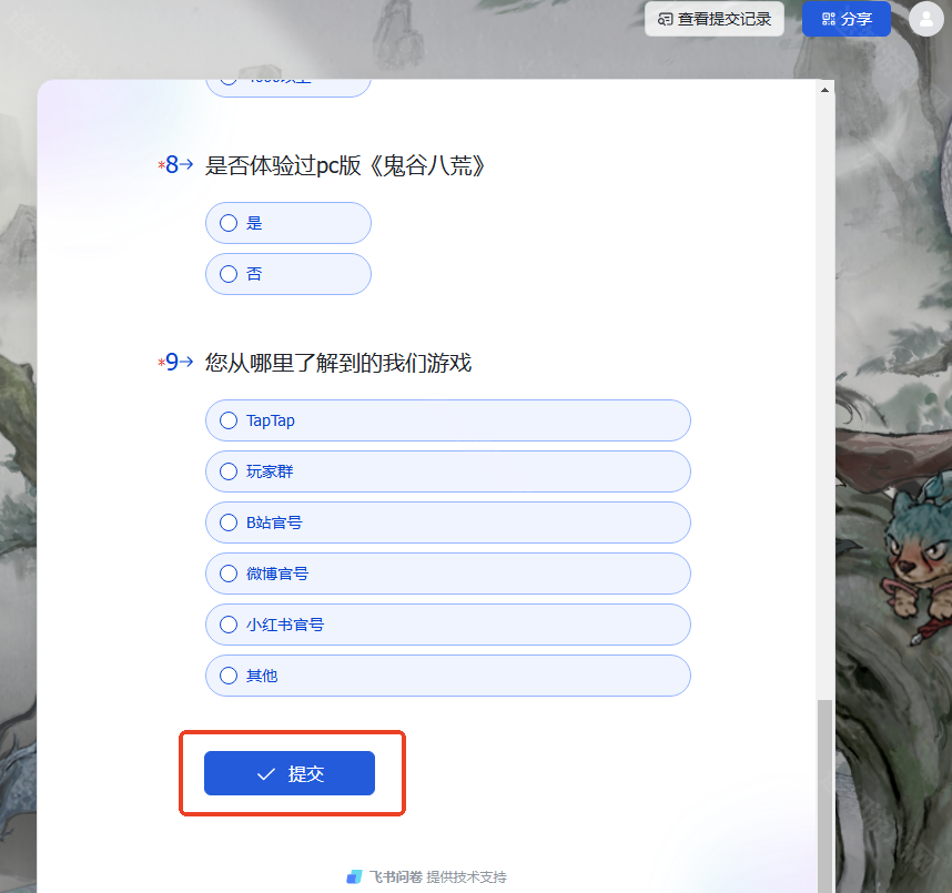 答:TapTap游戏页面-测试报名-填写问卷