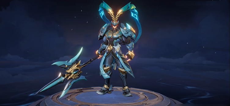 色彩上以代表未来科技的蓝色为主色调,再以古典的金色与绿色作为点缀。服饰设计上,以科技纤维面料和半透明材质来体现盔甲的科技感受,同时在翎羽、胸甲、护膝等处采用了金色云纹、龙纹等元素来强调东方古典韵味,惊艳夺目。