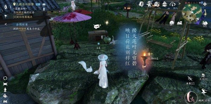 激活顺序为【无】红伞【穷】黄伞【碧】紫伞,在伞顶上跳就行。跳完后即可完成古诗“接天莲叶无穷碧,映日荷花别样红”,打开宝箱即可获取百家技能【铁山靠】~