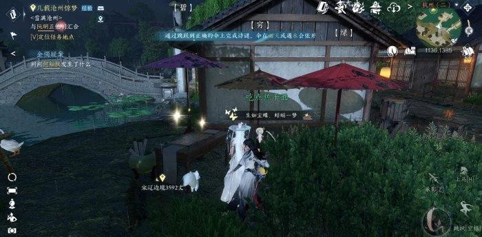 首先来到杭州(1136,1385),会看到三把伞(如果雨天会自动撑开,晴天需要对着伞使用技能【蛟龙戏水】才可以~