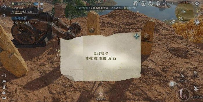 按照顺序对“变徵(zhi)”“徵”“变徵”“角”“商”对石块依次使用技能【风起云涌】,请从正面吹,不要在背面使用,不然会判定错误,全部完成后即可解锁宝箱~