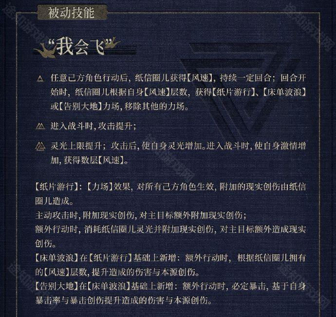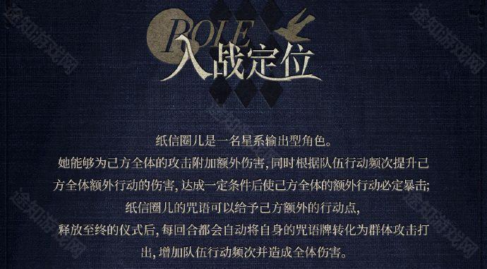 重返未来1999纸信圈儿怎么样?纸信圈儿是一名星系输出型角色,能够为己方全体的攻击附加额外伤害,同时根据队伍行动频次提升己方全体额外行动的伤害。那么这个角色有哪些技能呢?感兴趣的小伙伴接下来就和小编一起看看《重返未来1999》纸信圈儿角色介绍吧。