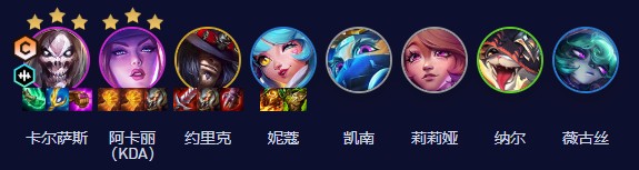 卡尔萨斯、阿卡丽(KDA)、约里克、妮蔻、凯南、莉莉娅、纳尔、薇古丝
