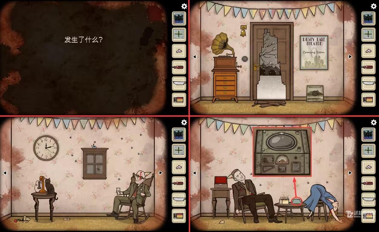 17、大门视角,将冰块放入祖父的杯子里,他说来点音乐;将唱片放到留声机的唱盘上,将针安装到唱头上后把唱臂移到唱盘中心,开始转动摇杆播放音乐。