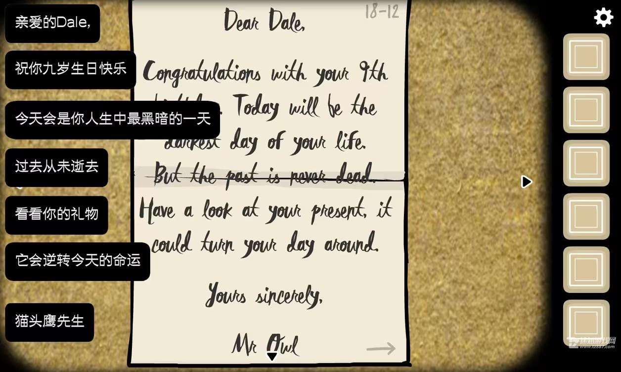 4、连续点击信将其展开,是猫头鹰先生寄来的,内容如图,右上角的18-12代表着戴尔的生日是12月18日。