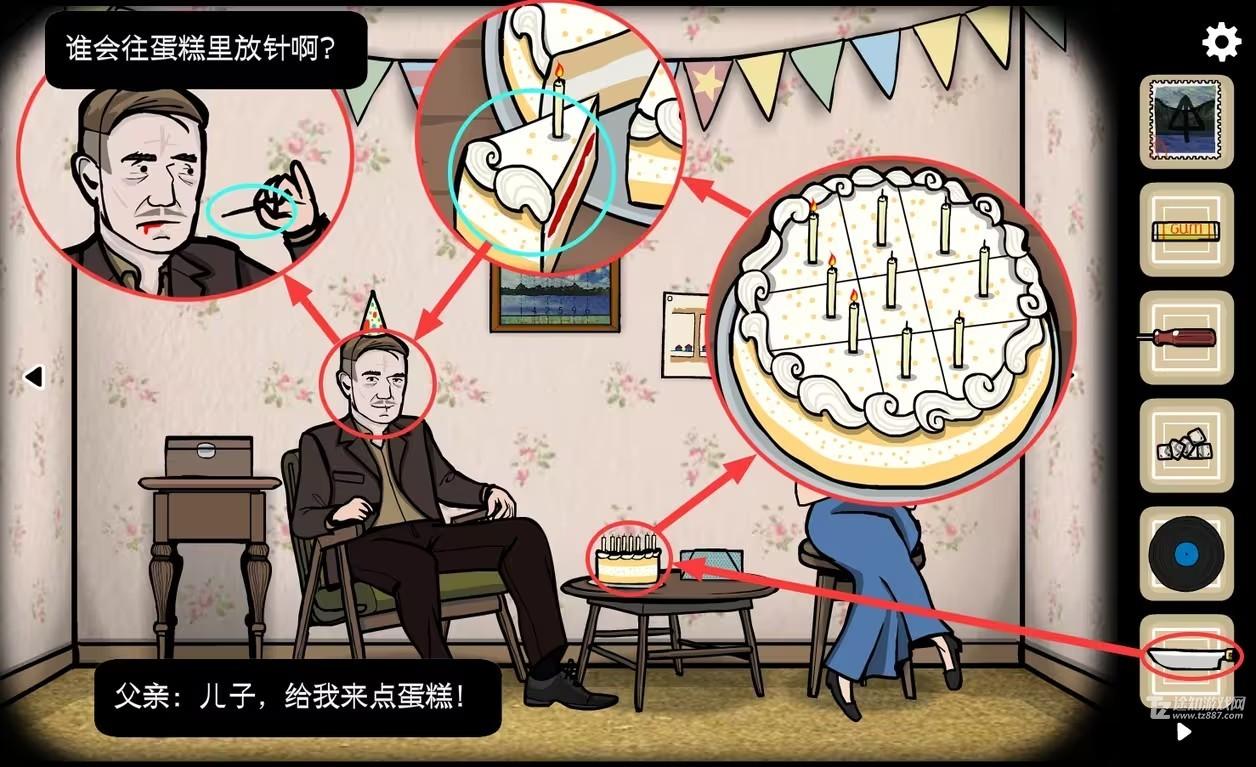 15、父母视角,父亲叫我们切蛋糕给他吃,点击桌子上的蛋糕,用刀划出一个井字,确保每一块蛋糕上都有一根蜡烛,切完后一块蛋糕自动移了出来,中间还流淌着鲜血。