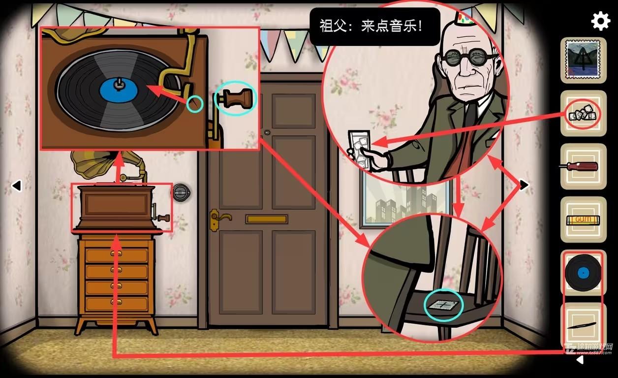 18、这时祖父开始站起来跳舞,获得椅子上的邮票。音乐播放一会后会停下,停下后祖父会重新坐下,再次播放需要重新转动摇杆。