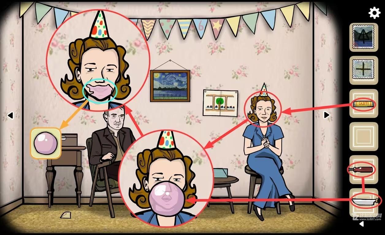 19、父母视角,把泡泡糖拿给母亲,等母亲吹出泡泡后用刀扎破泡泡,得到被嚼过的泡泡糖,同时获得成就【选择的武器】。用螺丝刀也能扎破但是没有成就。