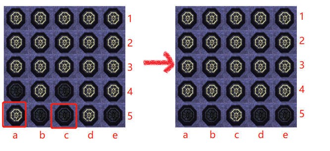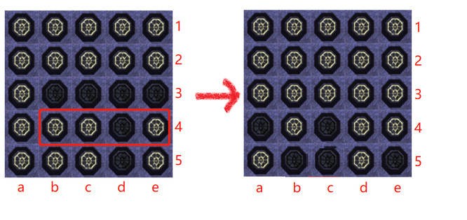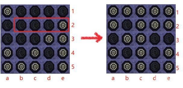 接下来看第4行,a、c两列灯灭,就去点第5行的a、c两列,把第4行全部点亮,点亮后如下图所示。