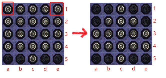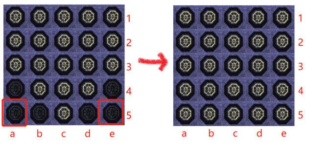 如果运气好的话到这一步第5行就可以全部点亮了,但这个布局的第5行还有a、b、d、e四个灯灭,这种情况就比较麻烦,需要再次回头把第一行的a、b、d、e四个灭掉,造成和第5行一样的布局。