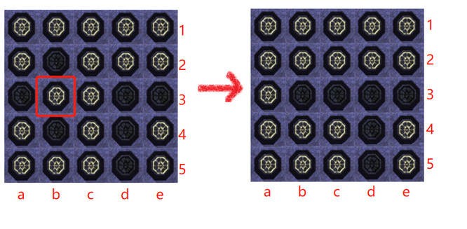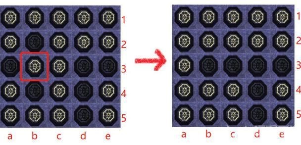 然后同样的方法看第2行只有b列灯灭,那就去点第3行的b列,就可以把第2行全部点亮,点亮后如下图所示。