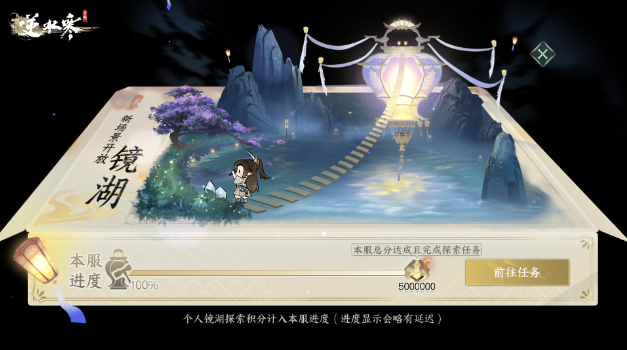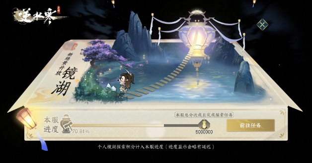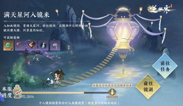 当玩家到达镜湖(通过世界地图或“呼吸”功能界面均可)后,就会收到【满天星河入镜来】任务,这是一个【全服协作任务】,本服所有玩家的贡献会汇总成一个大进度,直到任务进度被解锁。