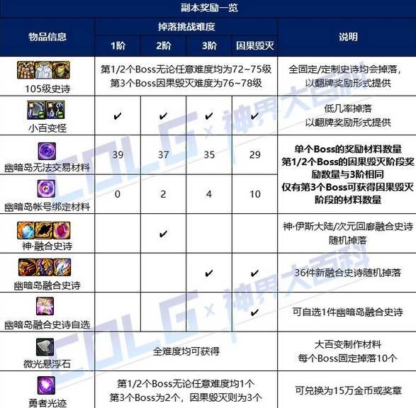 2、能够获得的奖励包括首饰和特殊装备部位的融合装备(贴膜),3阶段开始还会有几率直接掉落幽暗岛成品贴膜。