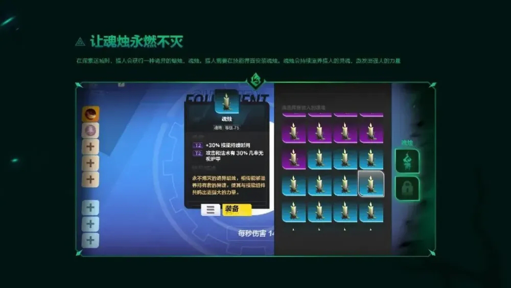 在探索迷城时,猎人会获得全新的装备道具“魂烛”。魂烛可以融合,消耗迷城烛泪可以将两支魂烛融为一体,融合结果可能更强大,获得极其珍贵的特殊词缀,当然也可能获得负面词缀。
