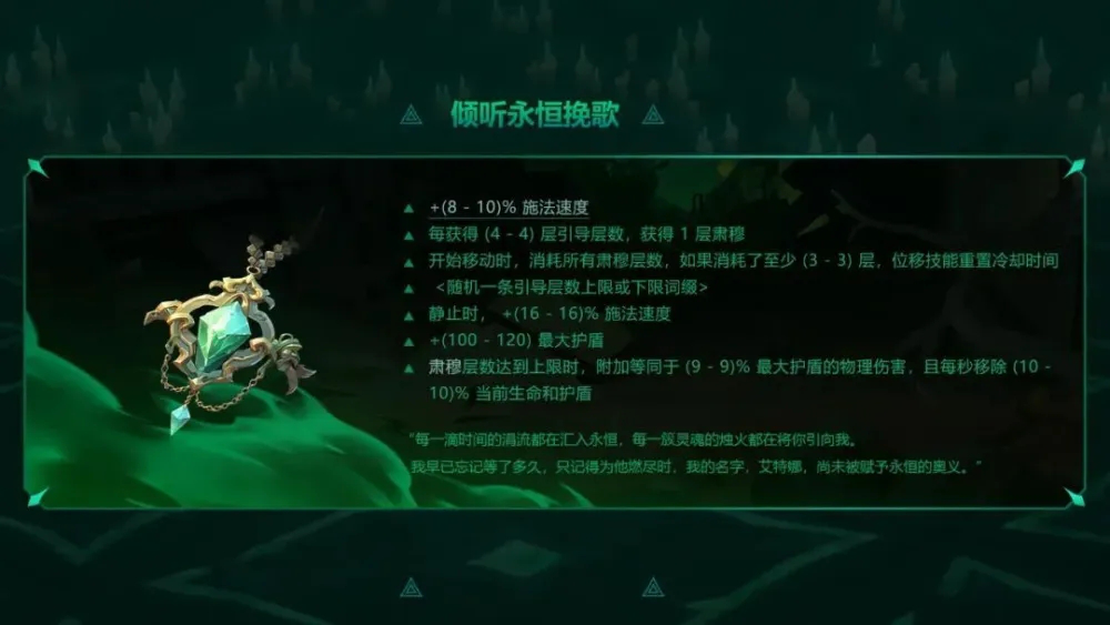 永生挽歌:传奇项链,引导时获得特殊增益“肃穆”,为技能根据护盾量附加物理点伤;